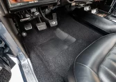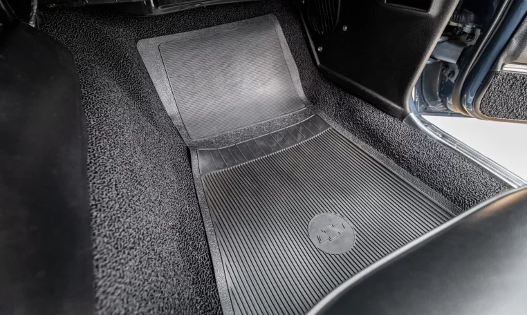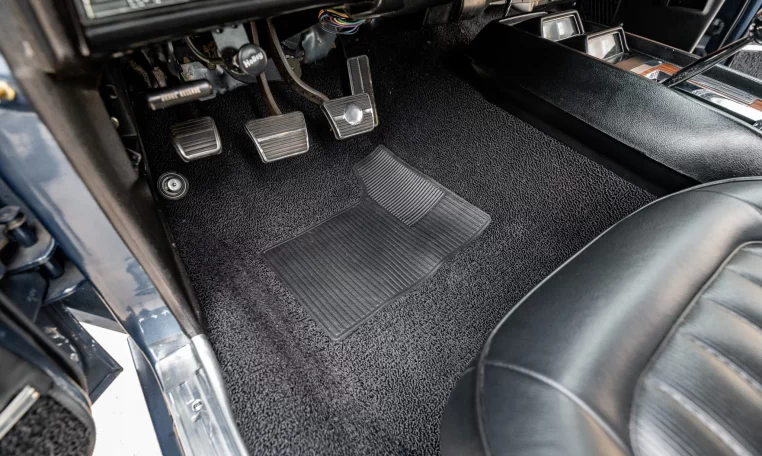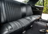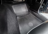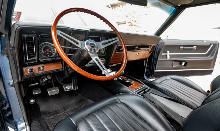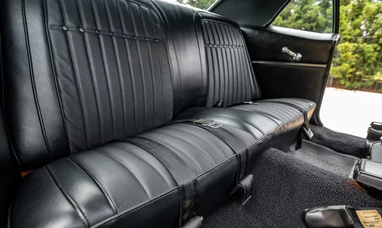 The car was ordered with black custom upholstery (712) covering the front bucket seats and rear bench, and the interior was retrimmed under prior ownership. The car retains a Delco AM radio, and further equipment includes a rosewood steering wheel mounted to a tilt column, a Hurst shifter, woodgrain trim, manually operated windows, and lap belts for the front and rear occupants.