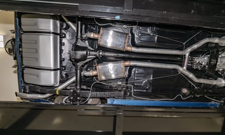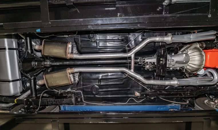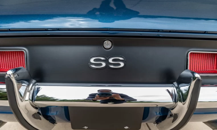SS-style wheels wear chrome trim rings along with staggered-width 14″ BFGoodrich white-letter tires, and a spare fitted with a Sailun tire is shown in the gallery below. The car is equipped with power-assisted front disc brakes and rear drums, and the suspension has been overhauled under current ownership.