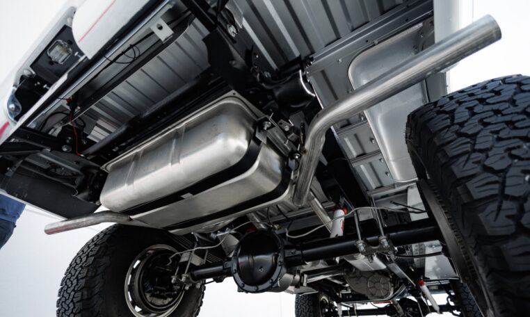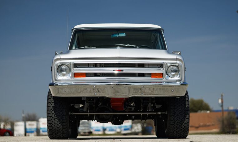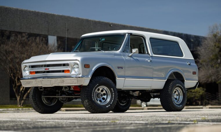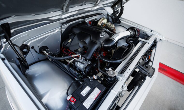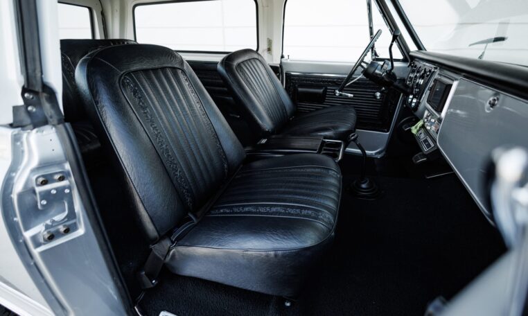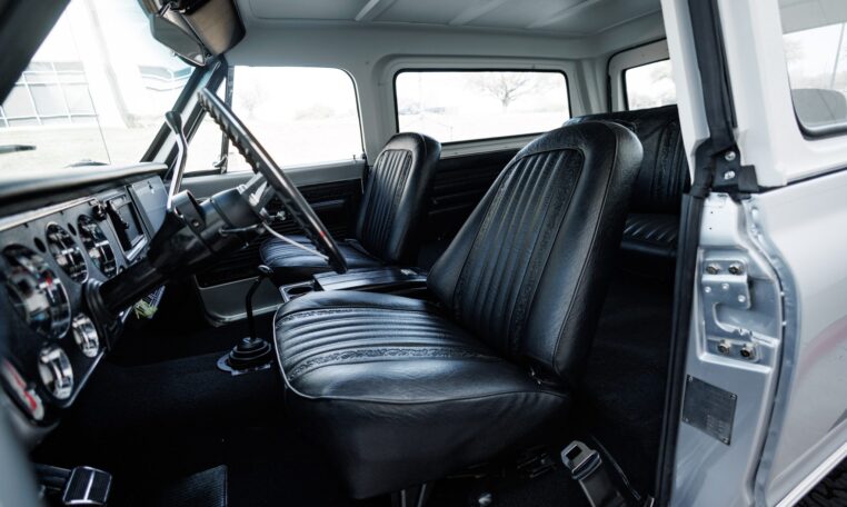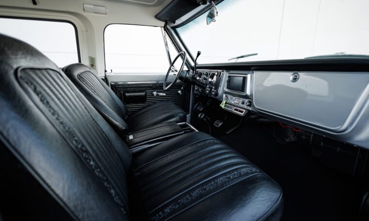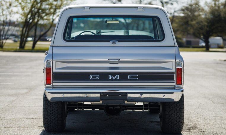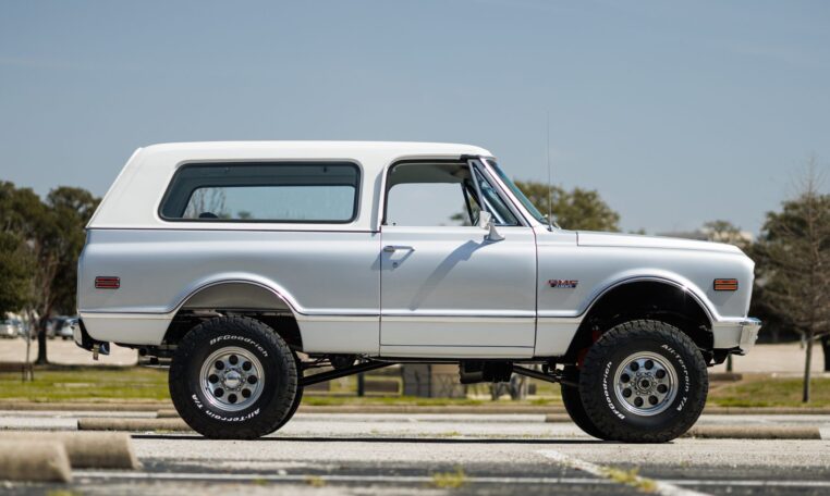This 1971 GMC Jimmy was modified and refurbished between 2022 and 2023, and work at that time reportedly included the installation of a 6.0-liter Vortec V8, rebuilding the three-speed automatic transmission, a repaint in silver and white, re-trimming the interior, and lifting the suspension and body. Rancho shocks, 15″ polished Ion wheels, 3.55:1 differentials, a Spectre cold-air intake, a touchscreen stereo, and an Old Air Products heat and air conditioning system have also been added. The truck also features power-assisted front disc brakes, power steering, a white removable hardtop, a Chevrolet C10-style hood and grille, and a dual-range transfer case.
