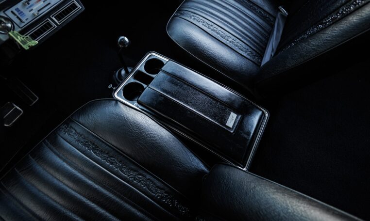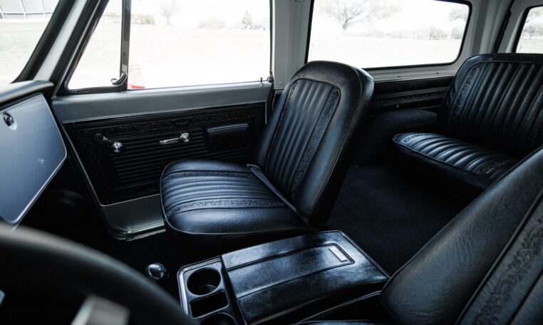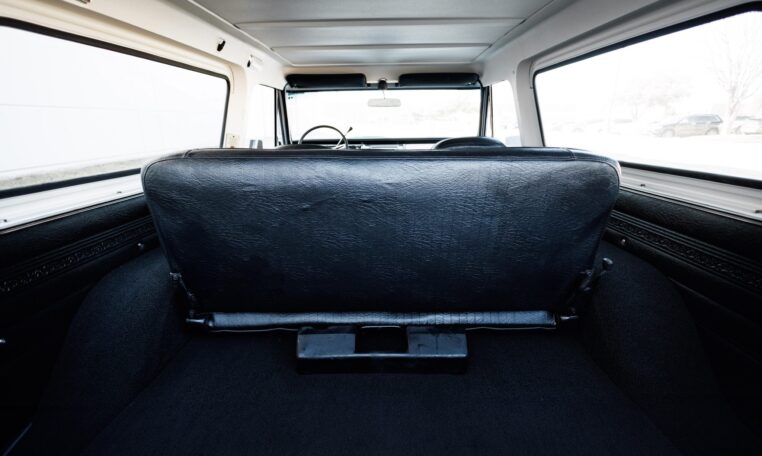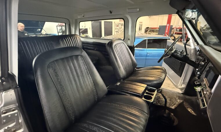 - The front bucket seats and rear bench were reupholstered in Parchment vinyl with green plaid inserts during the refurbishment. Additional work is said to have included replacing the dash pad, carpeting, door internals, and seals as well as installing a rebuilt power steering gearbox and an Old Air Products air conditioning system. The AM radio is accompanied by a Rockville 4-channel Bluetooth amplifier with a subwoofer, and aftermarket speakers.