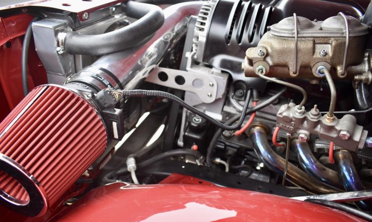 The 6.0-liter Vortec V8 features a custom air cleaner setup and was fitted using Dirty Dingo Motorsports mounts. The shaved and tucked engine bay also houses an aluminum radiator under a dimple-holed support.